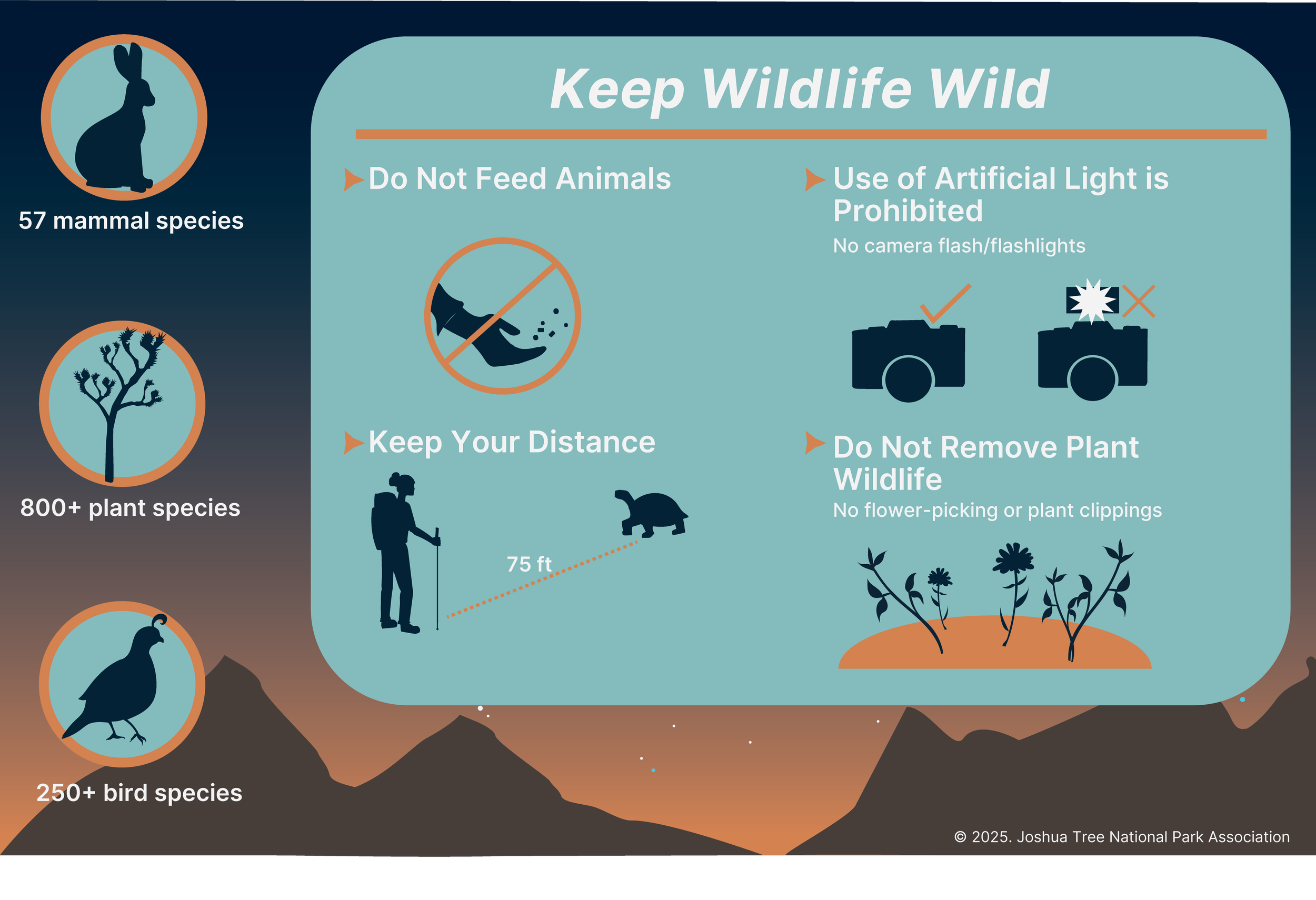 This infographic for Joshua Tree National Park Association (JTNPA) describes and illustrates the rules that visitors should follow when exploring Joshua Tree National Park.