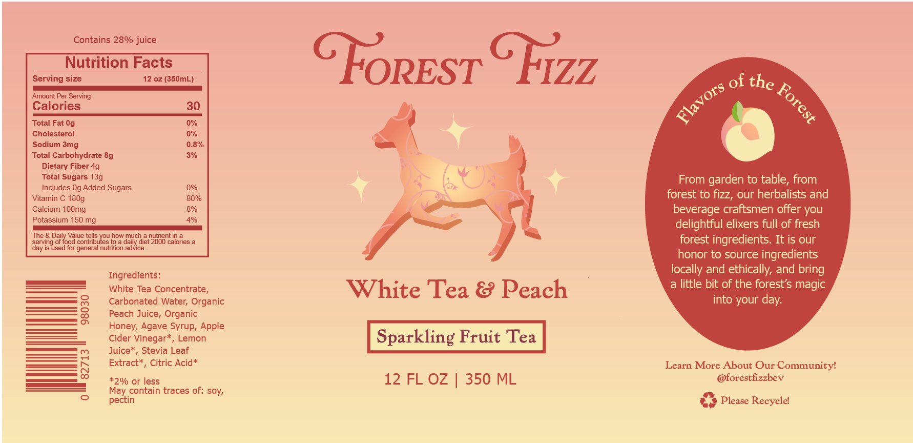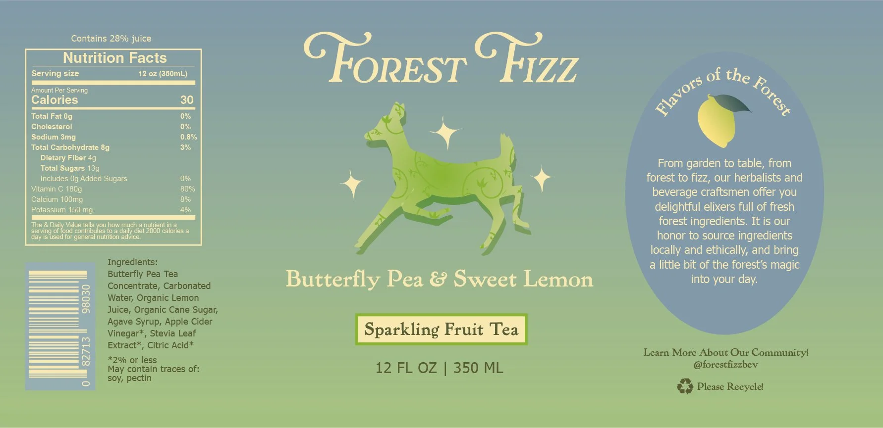 These labels reflect Forest Fizz’s values of nature, environmentalism, and health. The hand-drawn logo and use of earth & pastel tones echo that sense of nature, and add a touch of sweetness. Each design features a color palette reflective of the flavors, in order to spark the senses of the viewer. The goal is for the labels to attract the attention of customer’s who align with Forest Fizz’s values.